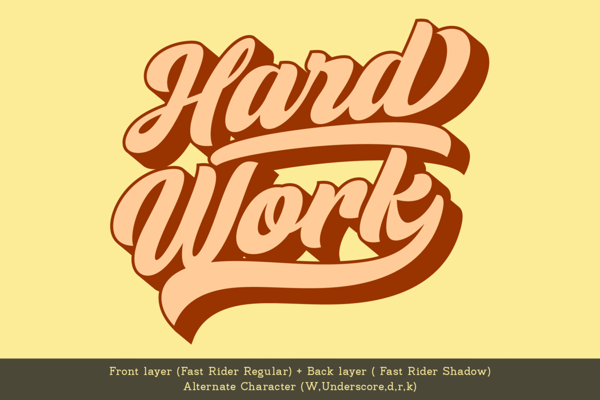 Plus, Fast Rider is PUA encoded, granting you seamless access to all of its special characters and swashes. This feature makes it effortless to explore and utilize the full range of design options, allowing you to focus on crafting exceptional, eye-catching designs. Embrace the retro charm and creative possibilities of Fast Rider, and let your projects ride the wave of stylish sophistication.