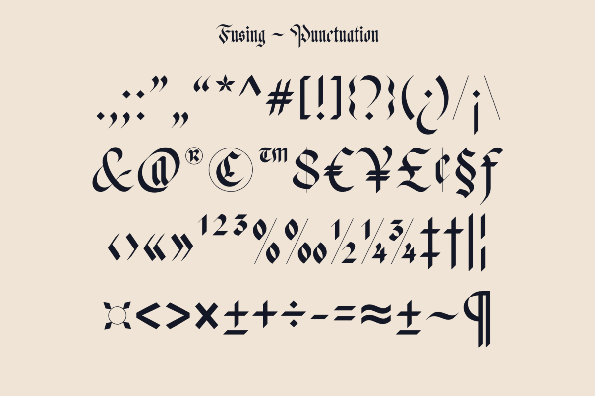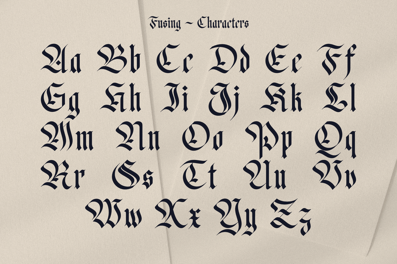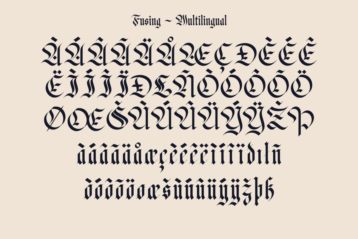 Fusing is a contemporary blackletter typeface inspired by European calligraphic traditions. With clean contours, angular tension, and consistent rhythm, it delivers gothic expression without ornamental distractions. Ideal for headlines, posters, and typographic art that seek bold character and historic depth.