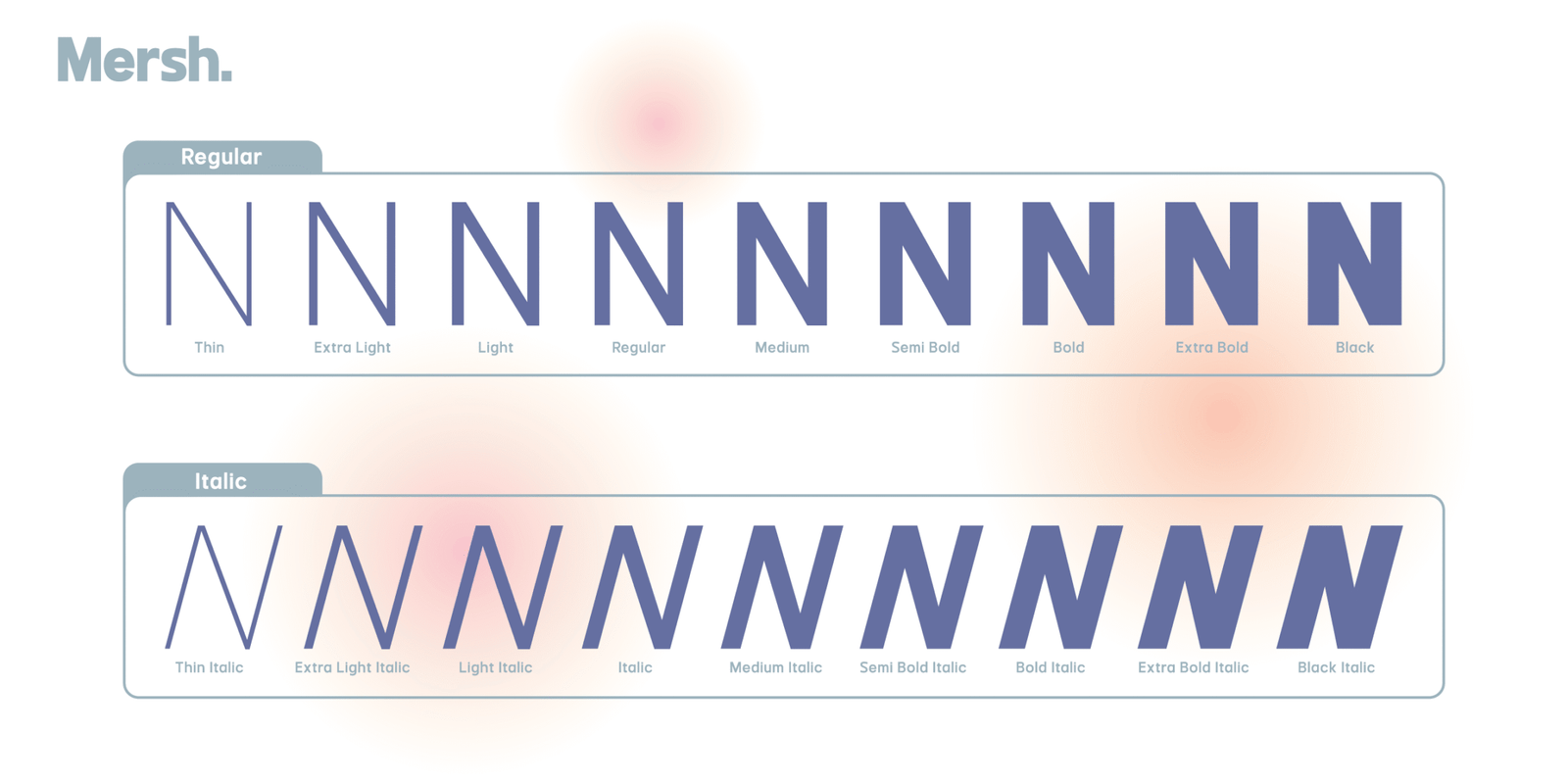 Introducing Mersh, an exceptional type system designed to elevate your design projects with sophistication and flexibility. This versatile typeface offers a comprehensive range of 18 distinct styles, encompassing 9 weights in both regular and italic variations. Mersh seamlessly bridges minimalist design trends with timeless typography principles, resulting in a typeface that exudes both modern elegance and classic charm.