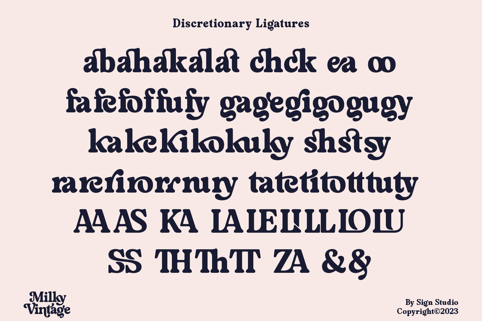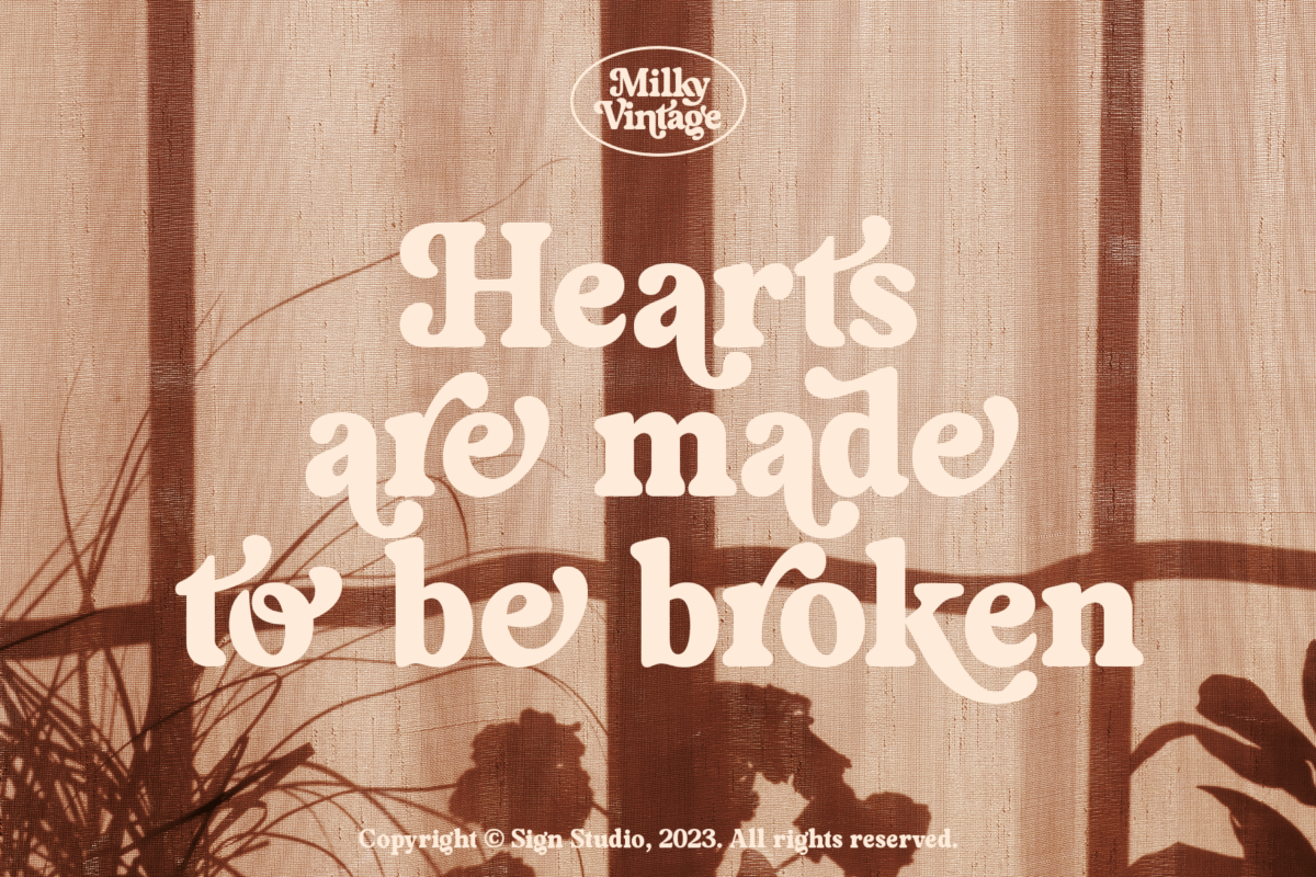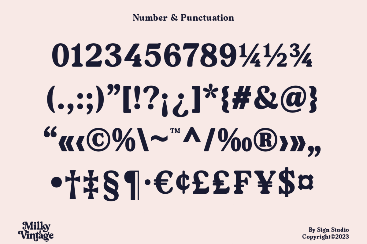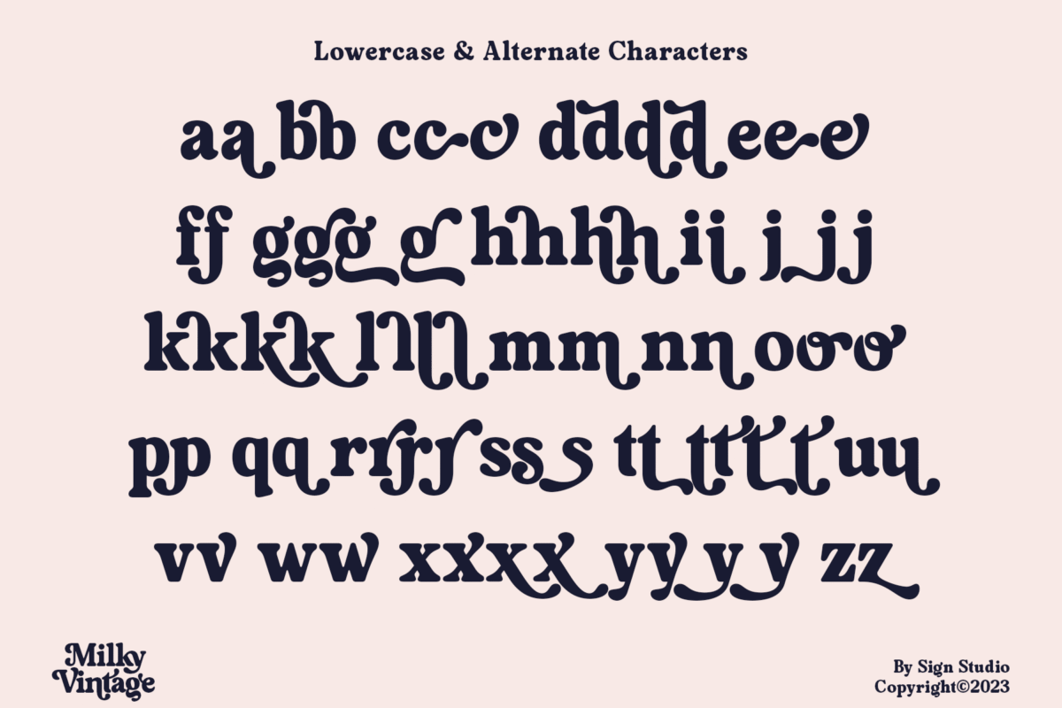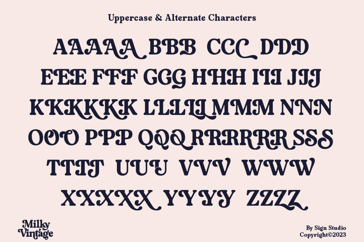 Milky Vintage has a sweet classic style so it is a suitable element for nostalgic themed designs. Equipped with alternative characters for Uppercase and Lowercase. Some Ligatures (Discretionary Ligatures) are also made to be neater and more beautiful. All characters have a PUA code so they can be easily accessed in most design editing software