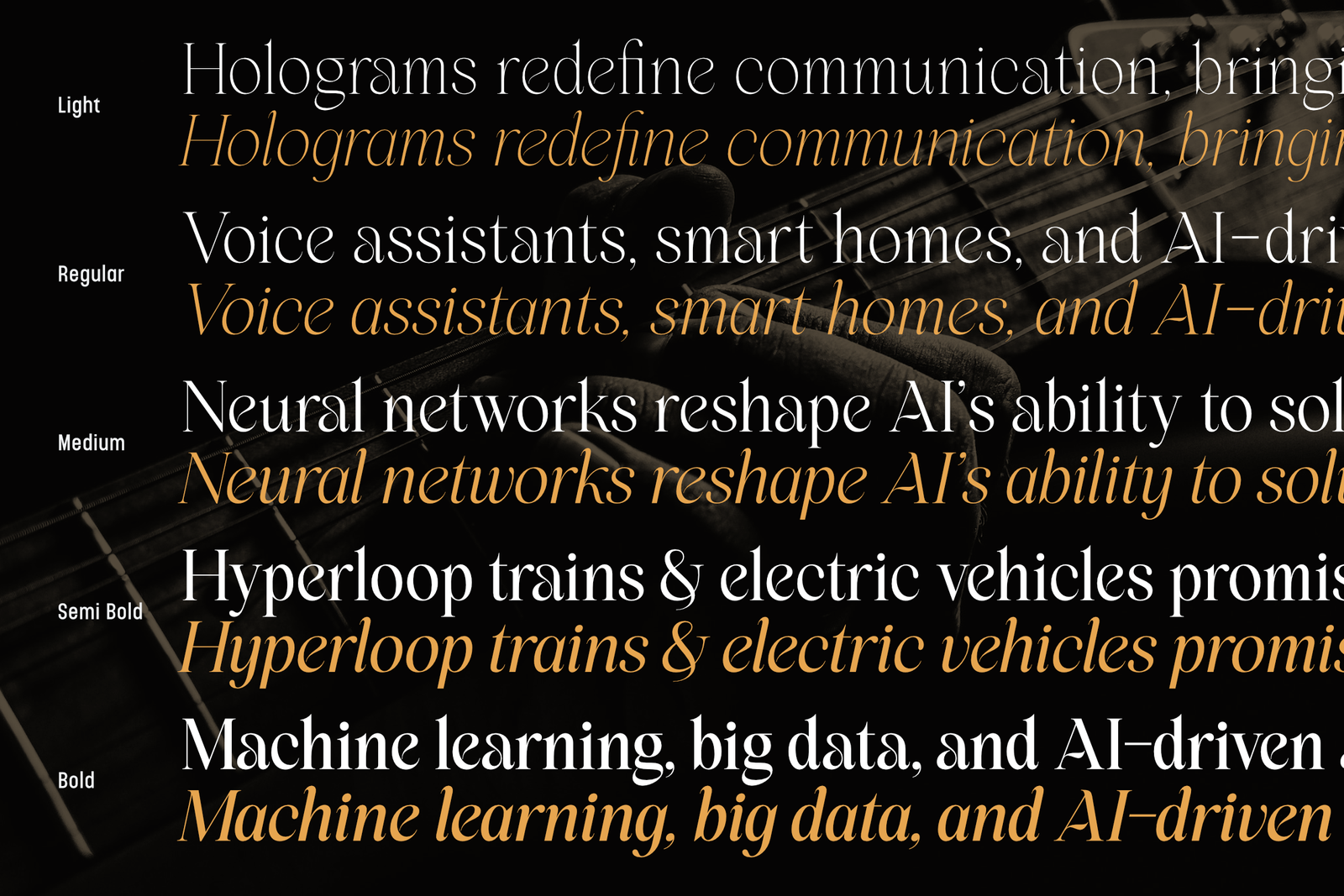 Available in five precisely crafted weights—from Light to Bold—Miralova functions as a cohesive typographic system. Each weight maintains structural consistency while providing enough distinction to establish hierarchy and rhythm within complex layouts.