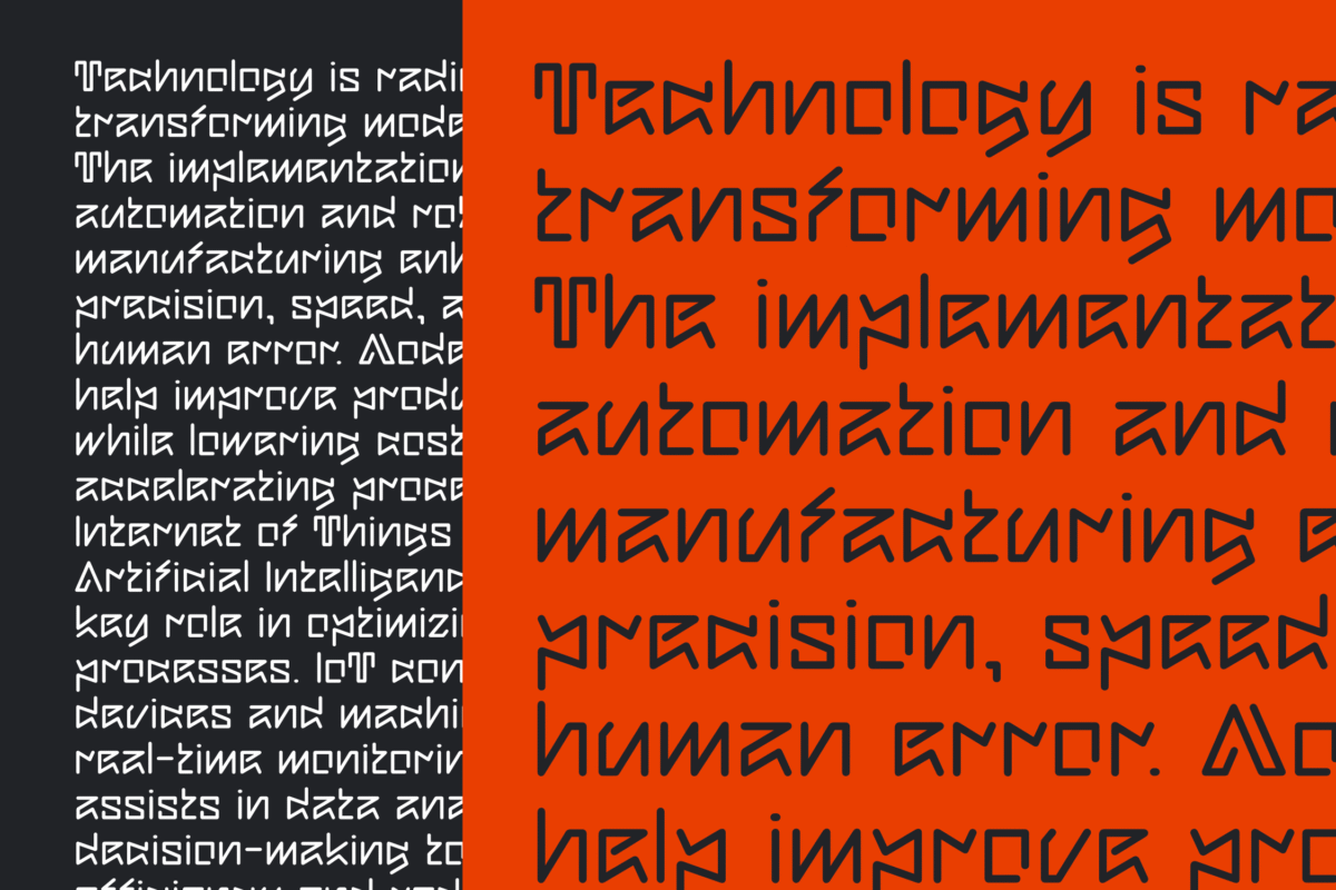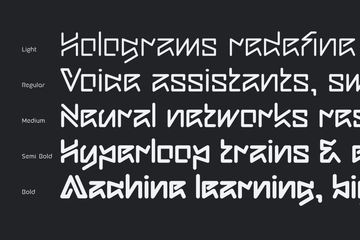 With 5 distinct weights, from Light to Bold, Navex adapts seamlessly across branding, UI display, posters, apparel, and experimental media. Its consistent stroke width reinforces a sleek, tech-forward character, while the stylized letterforms evoke alien scripts, digital encryption, or dystopian futurism.